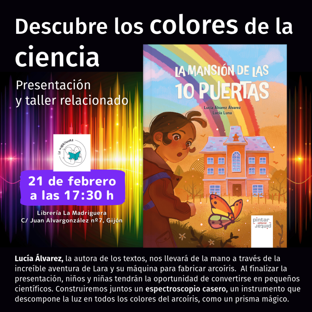Si quieres conocer más sobre La mansión de las 10 puertas, este viernes 21 de febrero a las 17:30 h se presentará el libro en la librería La Madriguera de Gijón. Además de la charla con la autora, los asistentes podrán participar en un taller donde construirán su propio espectroscopio, descubriendo así los secretos de la luz y el color.