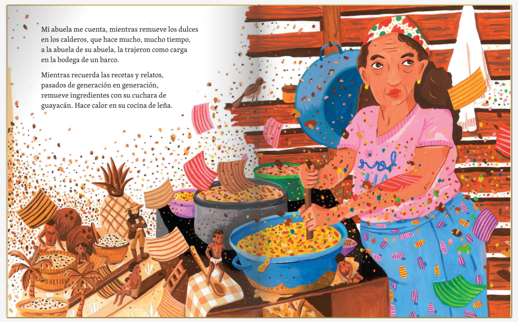 Alegría, de Virginia Read con ilustraciones de Ilemi Cuesta Mier, es un álbum ilustrado que entrelaza la historia familiar, la memoria afrodescendiente y la denuncia social, todo envuelto en el aroma de los dulces tradicionales del Caribe. A través de una narración poética, la obra nos presenta a Ariel, un niño que vende dulces mientras escucha, recuerda y transmite la historia de sus antepasados esclavizados.
