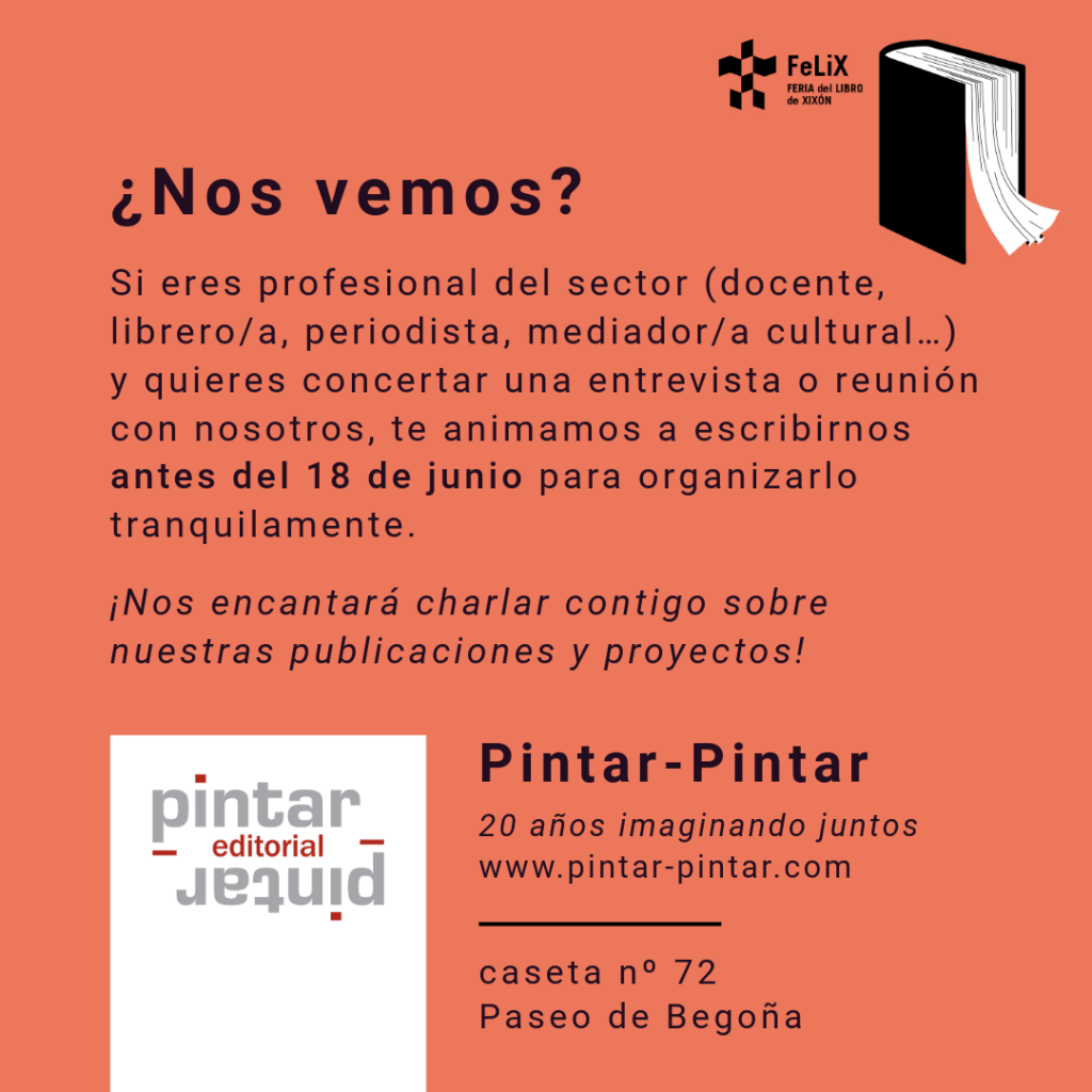 🗓️ Además, si eres profesional del sector (docente, librero/a, periodista, mediador/a cultural…) y quieres concertar una entrevista o reunión con nosotros, te animamos a escribirnos antes del 18 de junio para organizarlo tranquilamente. ¡Nos encantará charlar contigo sobre nuestras publicaciones y proyectos!