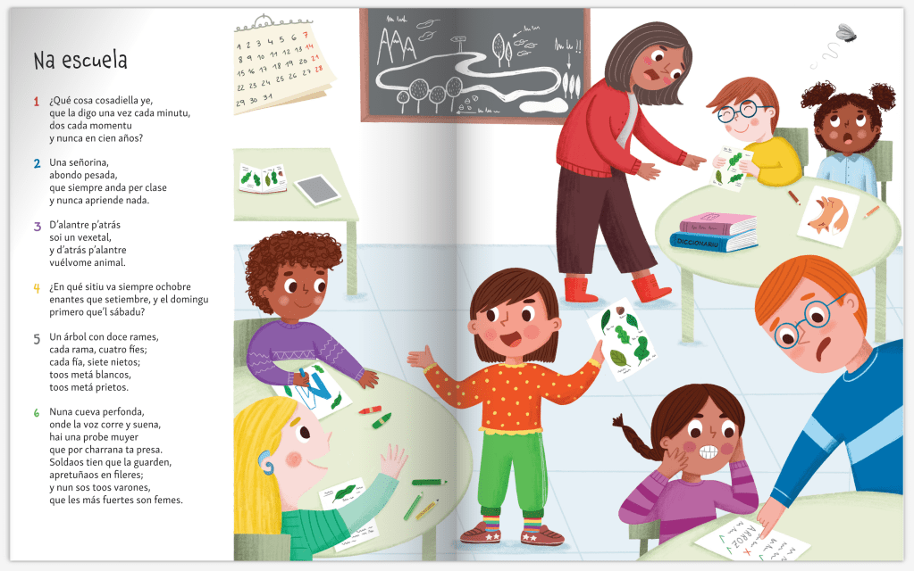 Un llibru pa xugar, imaxinar y adivinar, con escenes ilustraes enllenes de pistes, sorpreses y secretos. Una esbilla de cosadielles populares, poétiques y divertíes que percuerren les actividaes y momentos del día: na escuela, d’escursión, na plaza, na oriella de la mar… ¿Atréveste a intentar acertales? Ideal pa trabayar la oralidá, el pensamientu llateral, la comprensión llectora y la creatividá en neñes y neños de seis años p’arriba. Edición ilustrada y cuidosa que revaloriza les adivinances como tresoru lliterariu y cultural, favoreciendo igual la llectura autónoma que la compartida.