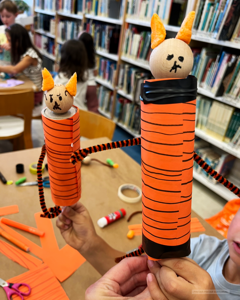 Tras la presentación del libro y la lectura —que cada niño y niña participante continuará en casa— nos pusimos manos a la obra con un taller de creación de títeres pop-up.