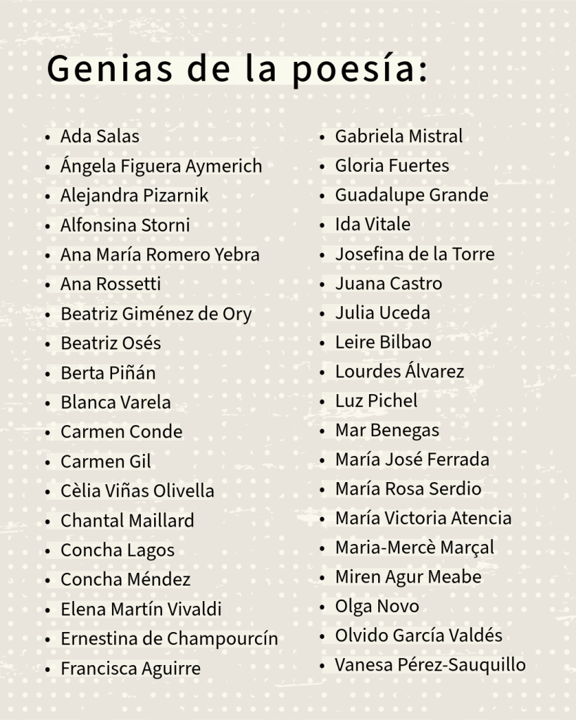 RELACIÓN DE POETAS: Ada Salas, Ángela Figuera Aymerich, Alejandra Pizarnik, Alfonsina Storni, Ana María Romero Yebra, Ana Rossetti, Beatriz Giménez de Ory, Beatriz Osés, Berta Piñán, Blanca Varela, Carmen Conde, Carmen Gil, Cèlia Viñas Olivella, Chantal Maillard, Concha Lagos, Concha Méndez, Elena Martín Vivaldi, Ernestina de Champourcín, Francisca Aguirre, Gabriela Mistral, Gloria Fuertes, Guadalupe Grande, Ida Vitale, Josefina de la Torre, Juana Castro, Julia Uceda, Leire Bilbao, Lourdes Álvarez, Luz Pichel, Mar Benegas, María José Ferrada, María Rosa Serdio, María Victoria Atencia, Maria-Mercè Marçal, Miren Agur Meabe, Olga Novo, Olvido García Valdés, Vanesa Pérez-Sauquillo