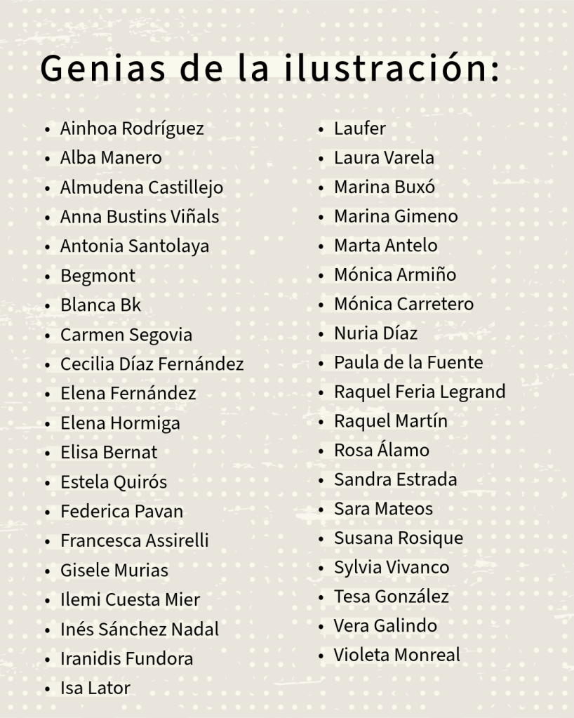 RELACIÓN DE ILUSTRADORAS: Ainhoa Rodríguez, Alba Manero, Almudena Castillejo, Anna Bustins Viñals, Antonia Santolaya, Begmont, Blanca Bk, Carmen Segovia, Cecilia Díaz Fernández, Elena Fernández, Elena Hormiga, Elisa Bernat, Estela Quirós, Federica Pavan, Francesca Assirelli, Gisele Murias, Ilemi Cuesta Mier, Inés Sánchez Nadal, Iranidis Fundora, Isa Lator, Laufer, Laura Varela, Marina Buxó, Marina Gimeno, Marta Antelo, Mónica Armiño, Mónica Carretero, Nuria Díaz, Paula de la Fuente, Raquel Feria Legrand, Raquel Martín, Rosa Álamo, Sandra Estrada, Sara Mateos, Susana Rosique, Sylvia Vivanco, Tesa González, Vera Galindo, Violeta Monreal.