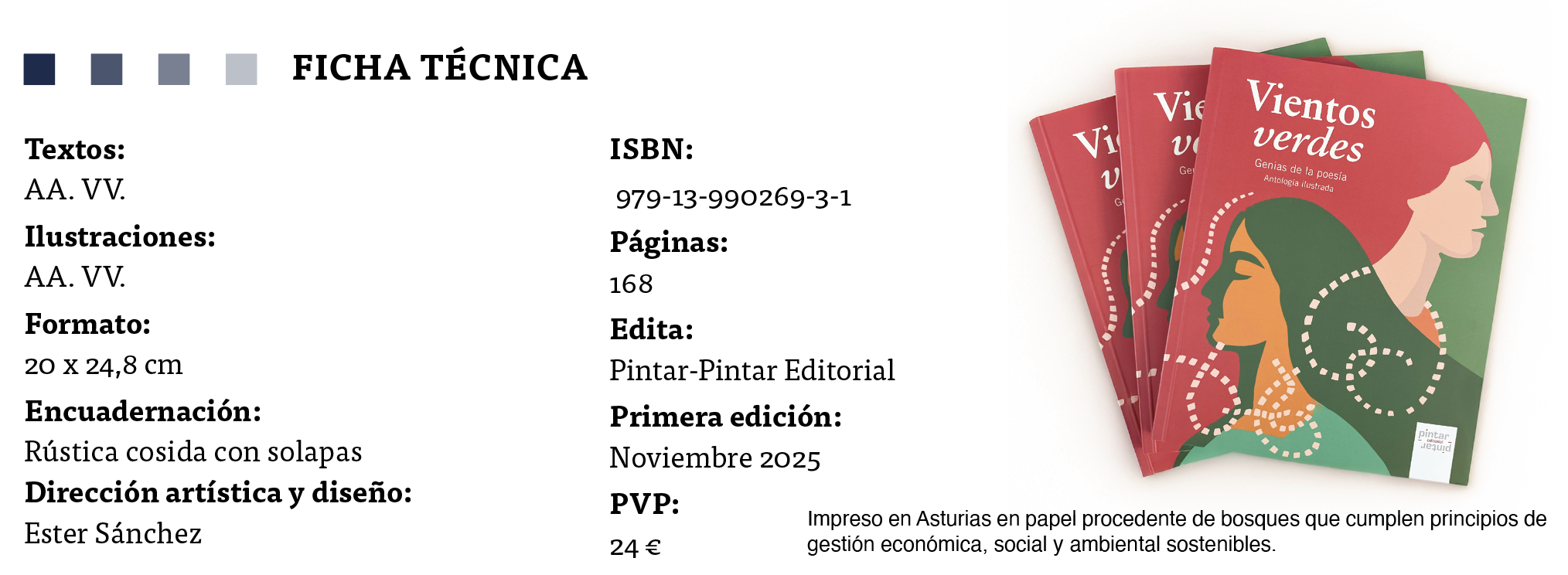 Vientos verdes es también un homenaje a las mujeres que escriben, ilustran, editan, leen y transmiten poesía. Una manera especial de celebrar las dos décadas de Pintar-Pintar Editorial, un sello que, desde Asturias, ha impulsado una visión del libro ilustrado como territorio de belleza, pensamiento y sensibilidad. Un libro que sopla nuevos vientos: verdes, libres y necesarios.
