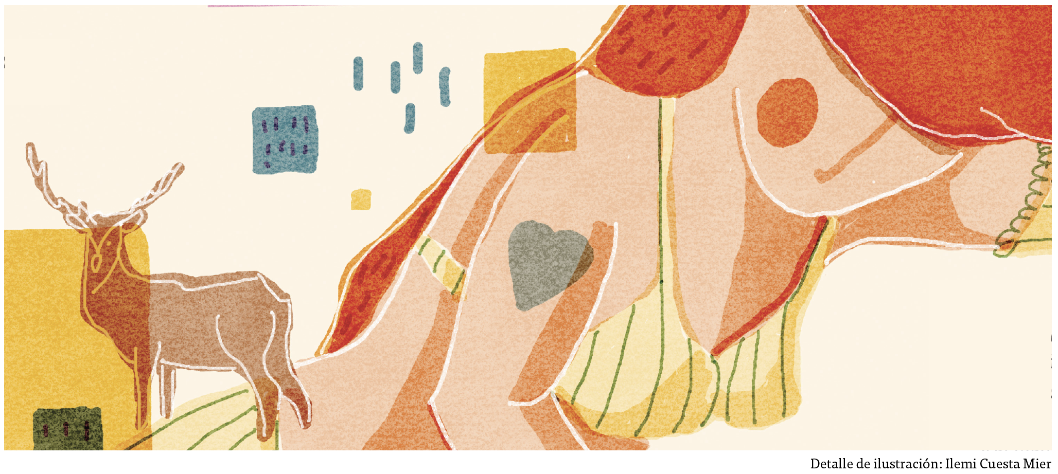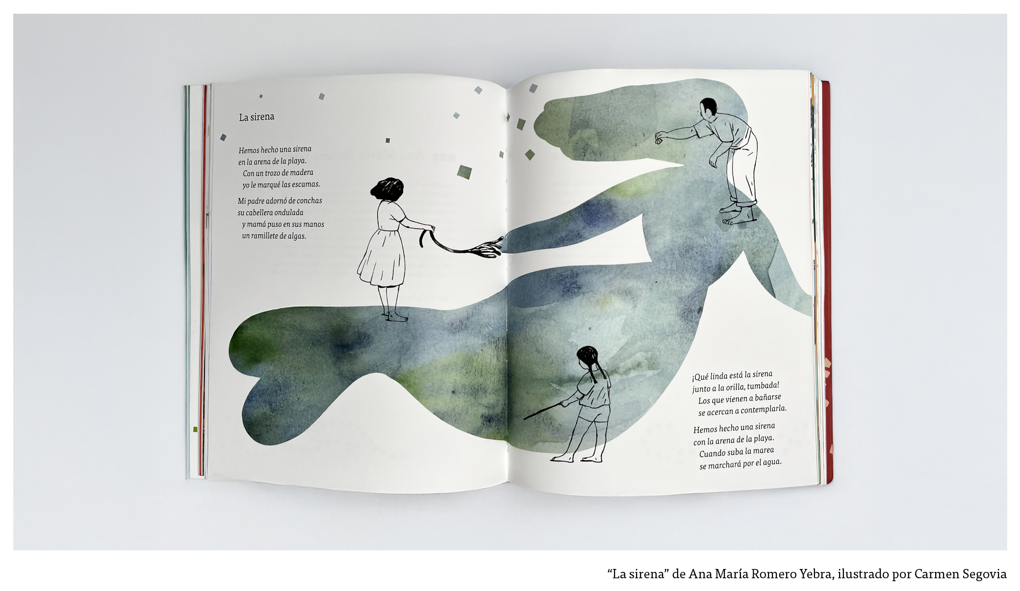 Cada poema ha sido interpretado en una doble página por una ilustradora distinta, con libertad creativa. Las imágenes no buscan ilustrar literalmente, sino dialogar con los textos desde lo simbólico, lo atmosférico y lo emocional. En ellas aparece un gesto gráfico sutil: pequeñas formas cuadrangulares de color que se dispersan como partículas de lo no dicho —recuerdos, deseos, emociones— y que actúan como hilo visual a lo largo de todo el libro.