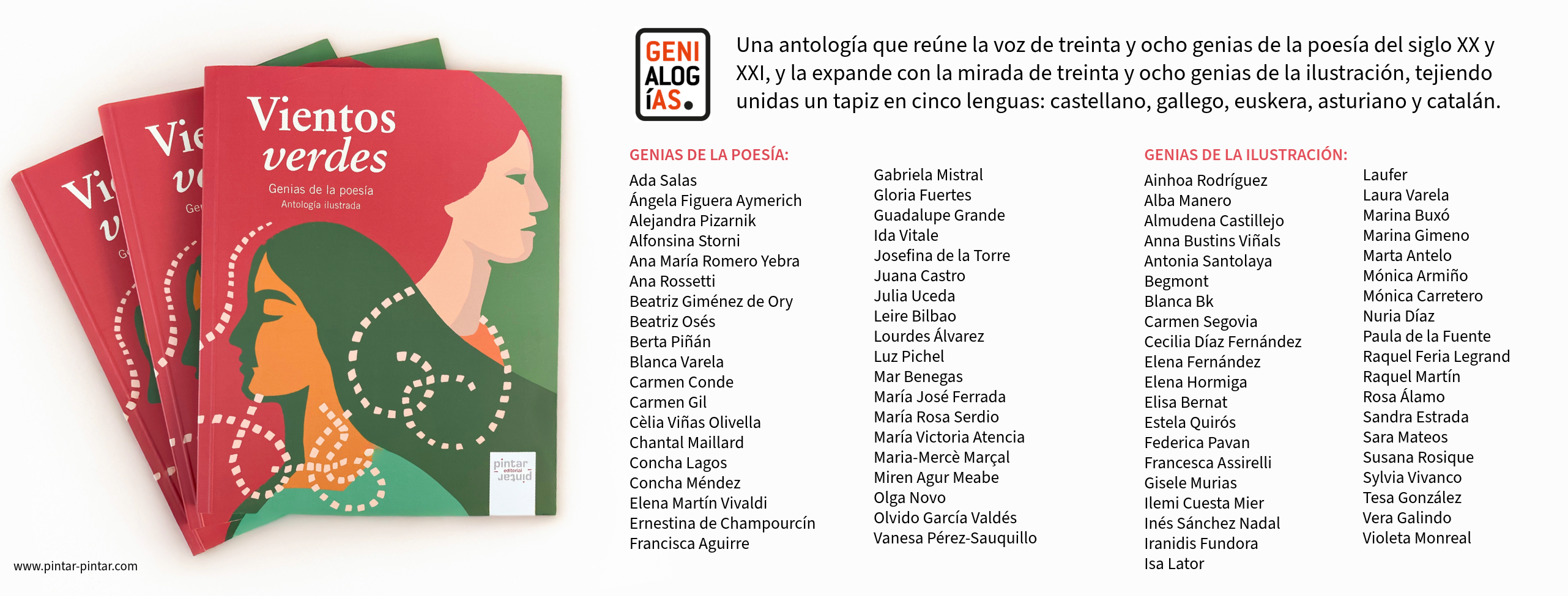 Esta antología ilustrada nace del impulso de la asociación feminista de mujeres poetas Genialogías, cuyo trabajo tiene como objetivo difundir y apoyar la poesía escrita por mujeres. Desde ese propósito surge Vientos Verdes. Genias de la poesía, un proyecto que quiere contribuir a enriquecer el universo poético que se ofrece a niñas y niños, dando a conocer a autoras referentes en la poesía universal y celebrando también a las autoras imprescindibles en la poesía dirigida a público infantil.