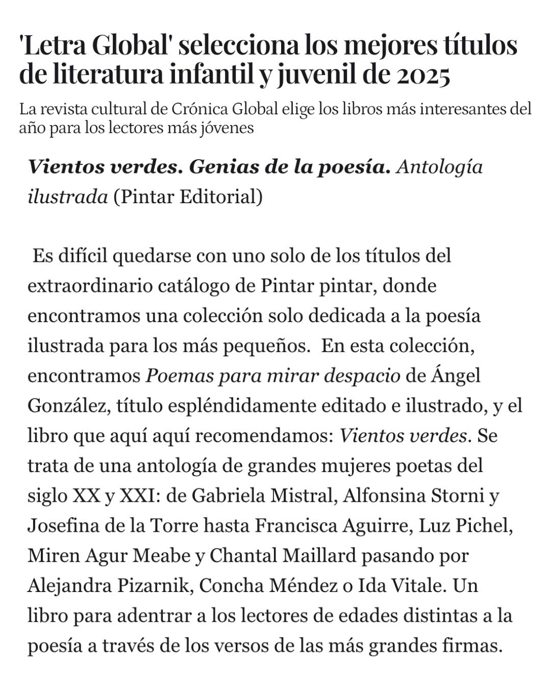 La revista cultural Letra Global, perteneciente al diario Crónica Global, ha incluido «Vientos verdes. Genias de la poesía» en su selección de los mejores títulos de literatura infantil y juvenil de 2025.