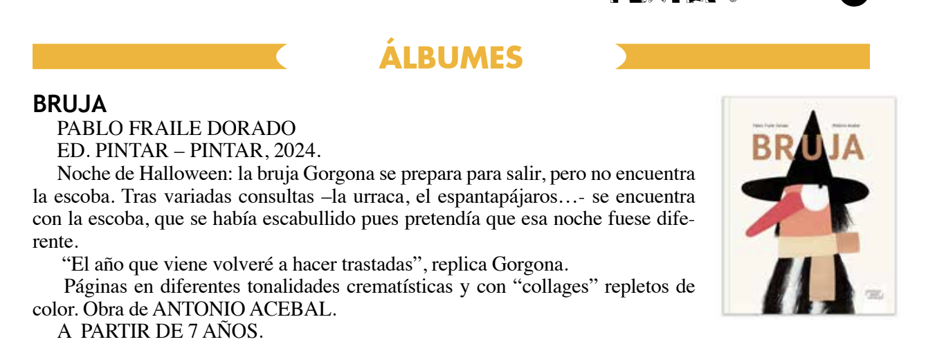 Además, en la selección bibliográfica del número se incluye el álbum ilustrado Bruja, escrito por Pablo Fraile Dorado e ilustrado por Antonio Acebal, publicado por Pintar‑Pintar.