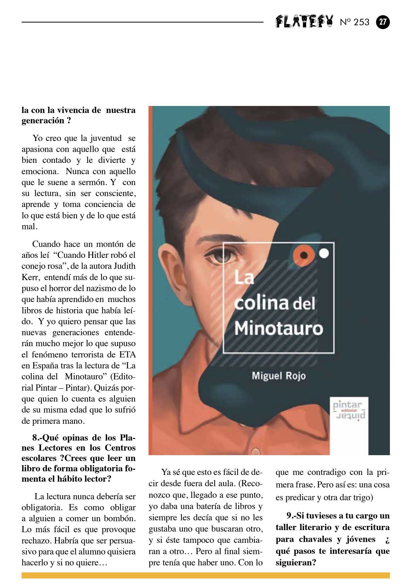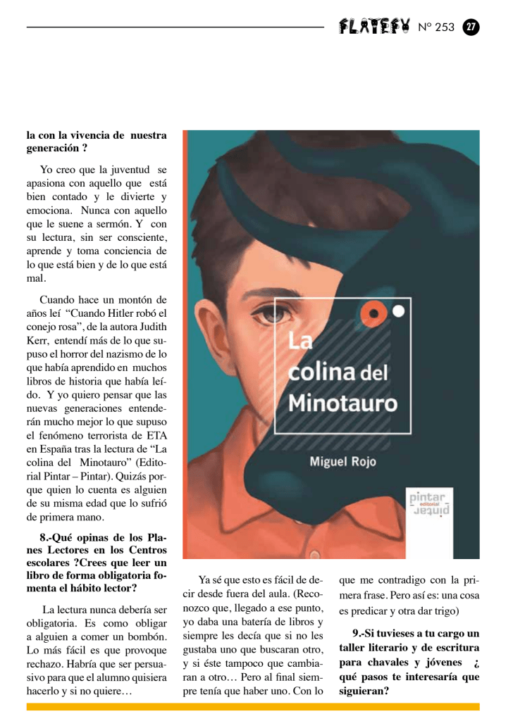 La entrevista gira en buena medida en torno a su novela juvenil La colina del Minotauro, publicada por Pintar-Pintar, una obra que invita a la reflexión sobre la memoria, la violencia y la experiencia generacional desde una mirada literaria honesta y cercana, pensada para acompañar a adolescentes y jóvenes en la construcción de su pensamiento crítico.