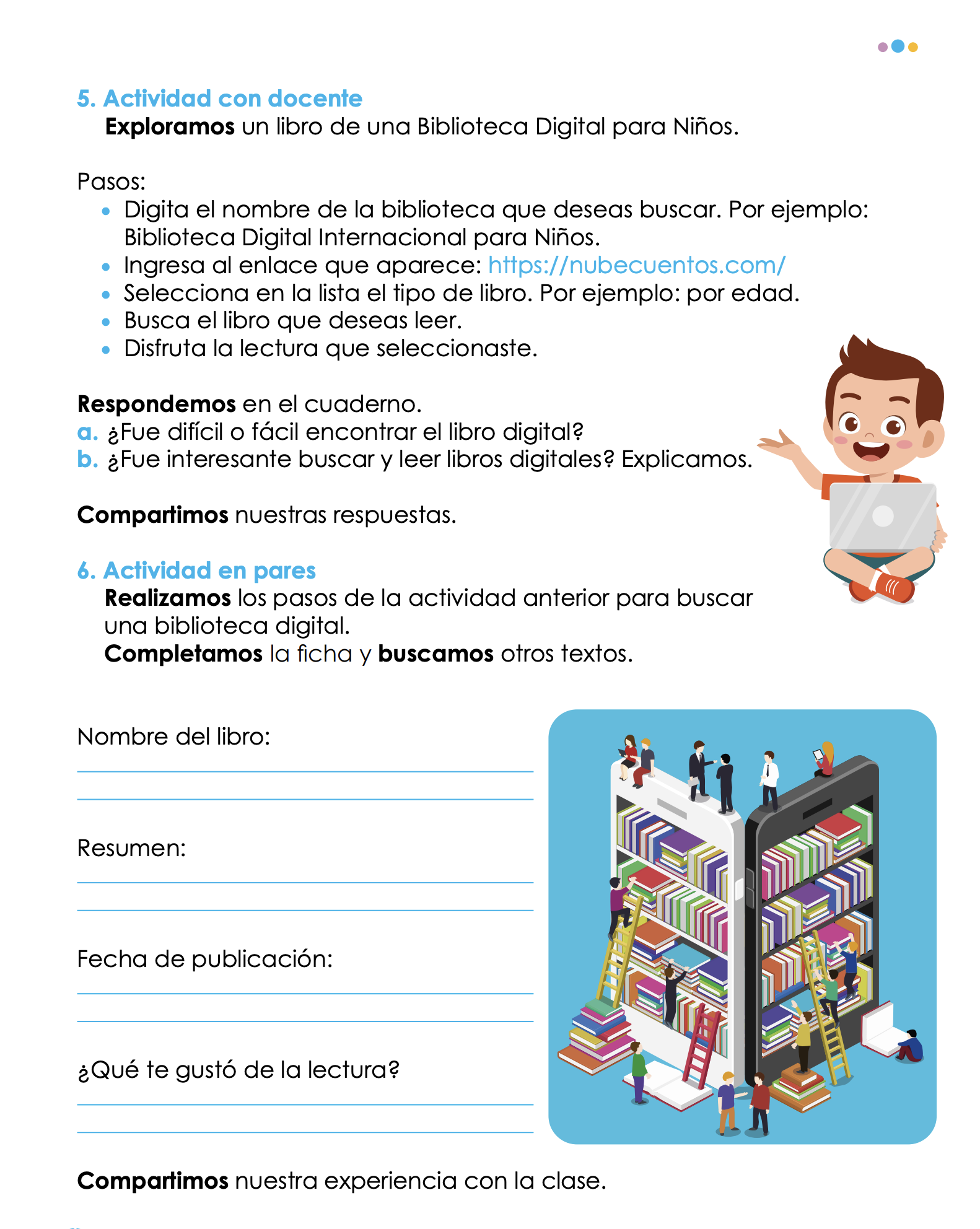 El manual forma parte de los materiales oficiales de Educación Primaria elaborados por el Departamento de Currículo y Materiales Educativos del Ministerio salvadoreño. En una unidad dedicada a la exploración de bibliotecas digitales infantiles, se invita al alumnado a ingresar en https://nubecuentos.com/ para buscar y leer un libro en línea.