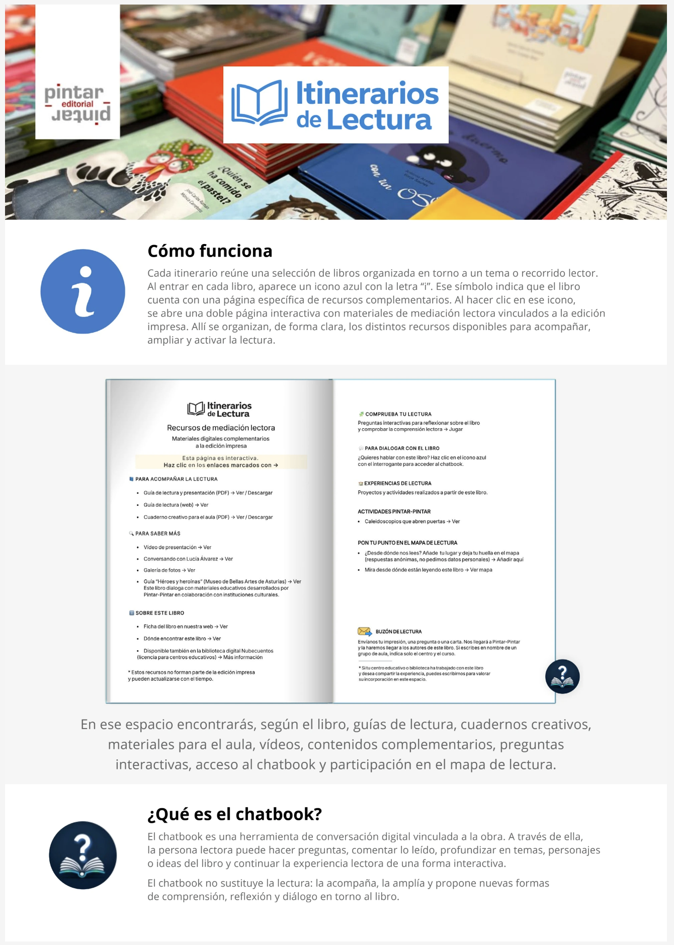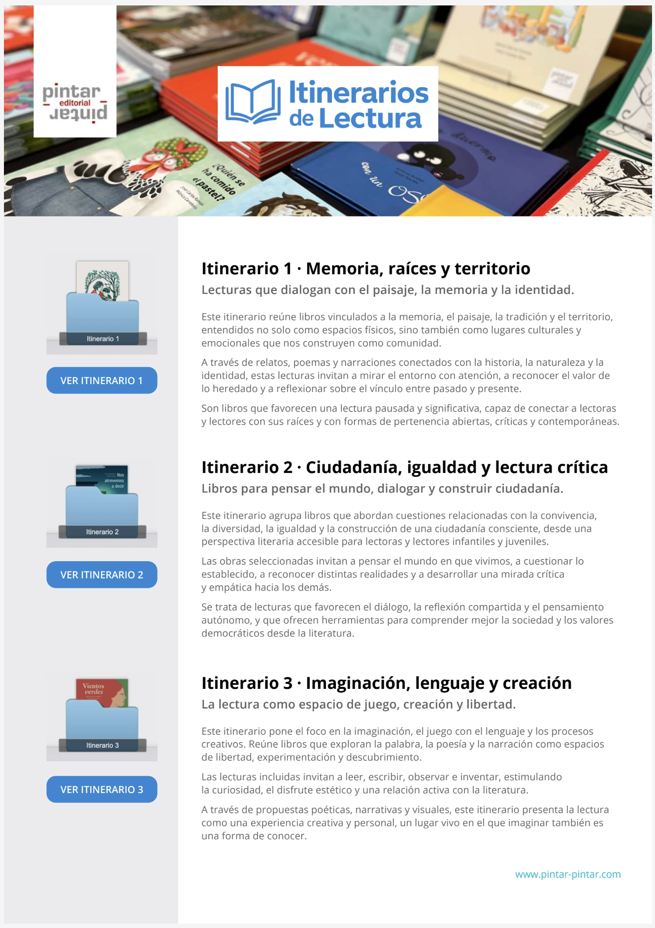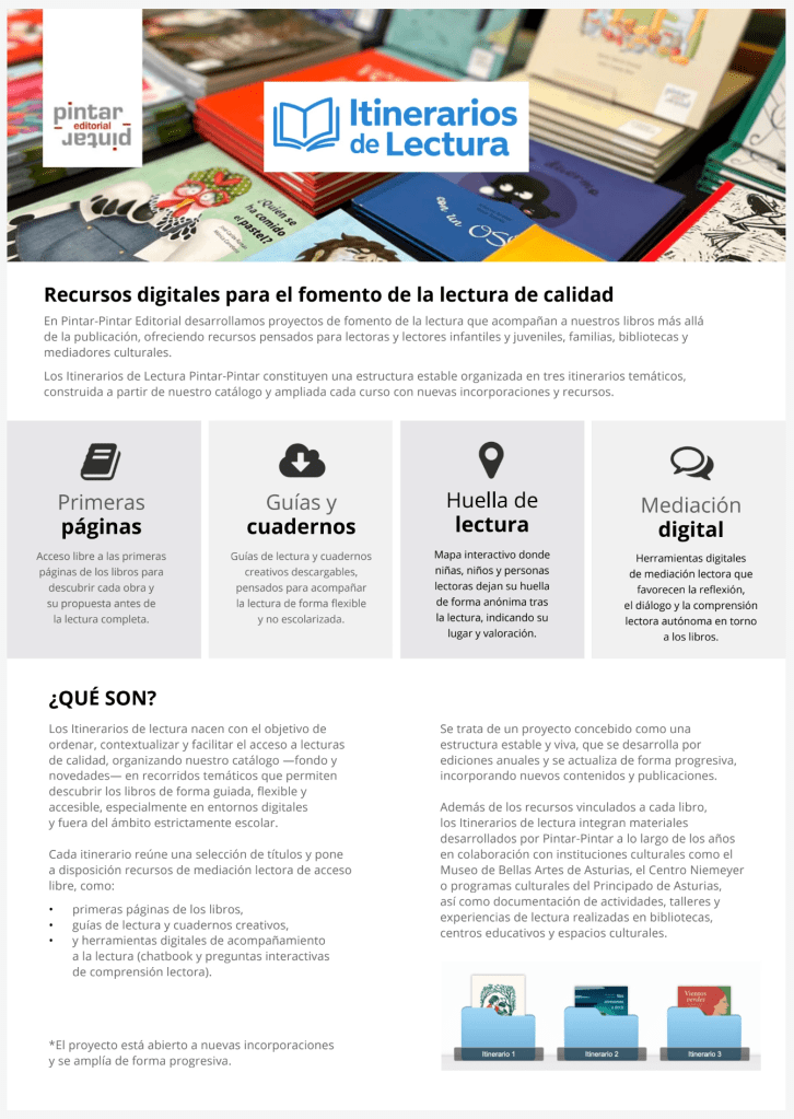 En Pintar-Pintar seguimos dando pasos en uno de nuestros proyectos de este año: los Itinerarios de Lectura 2026, una propuesta de mediación lectora digital que organiza títulos, primeras páginas y recursos complementarios en torno a distintos recorridos temáticos.