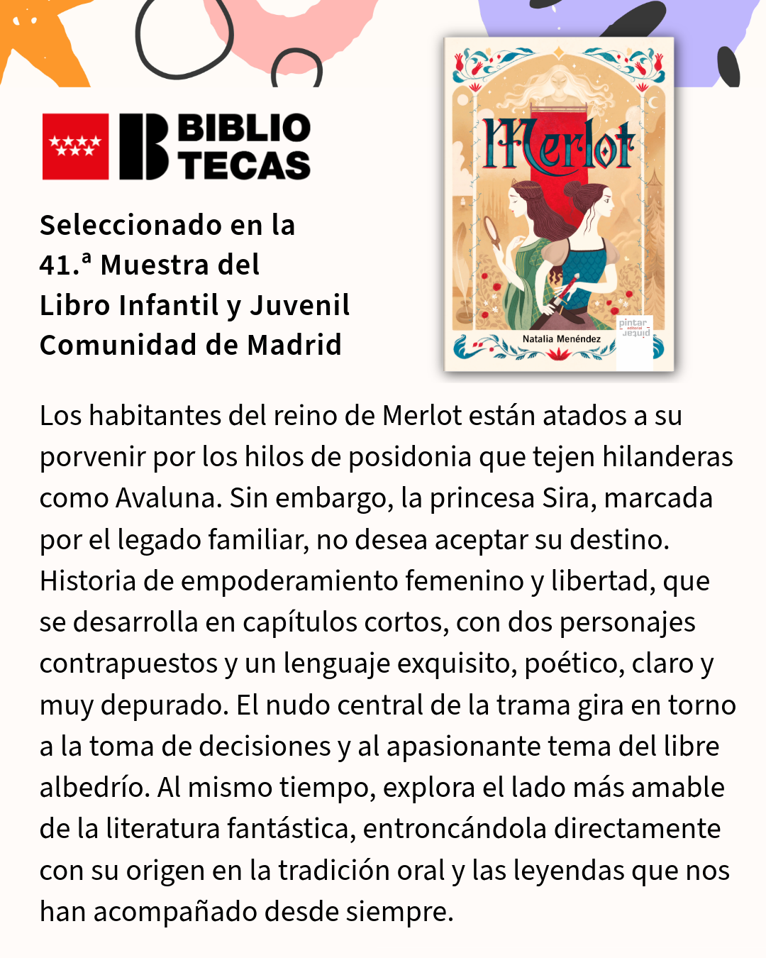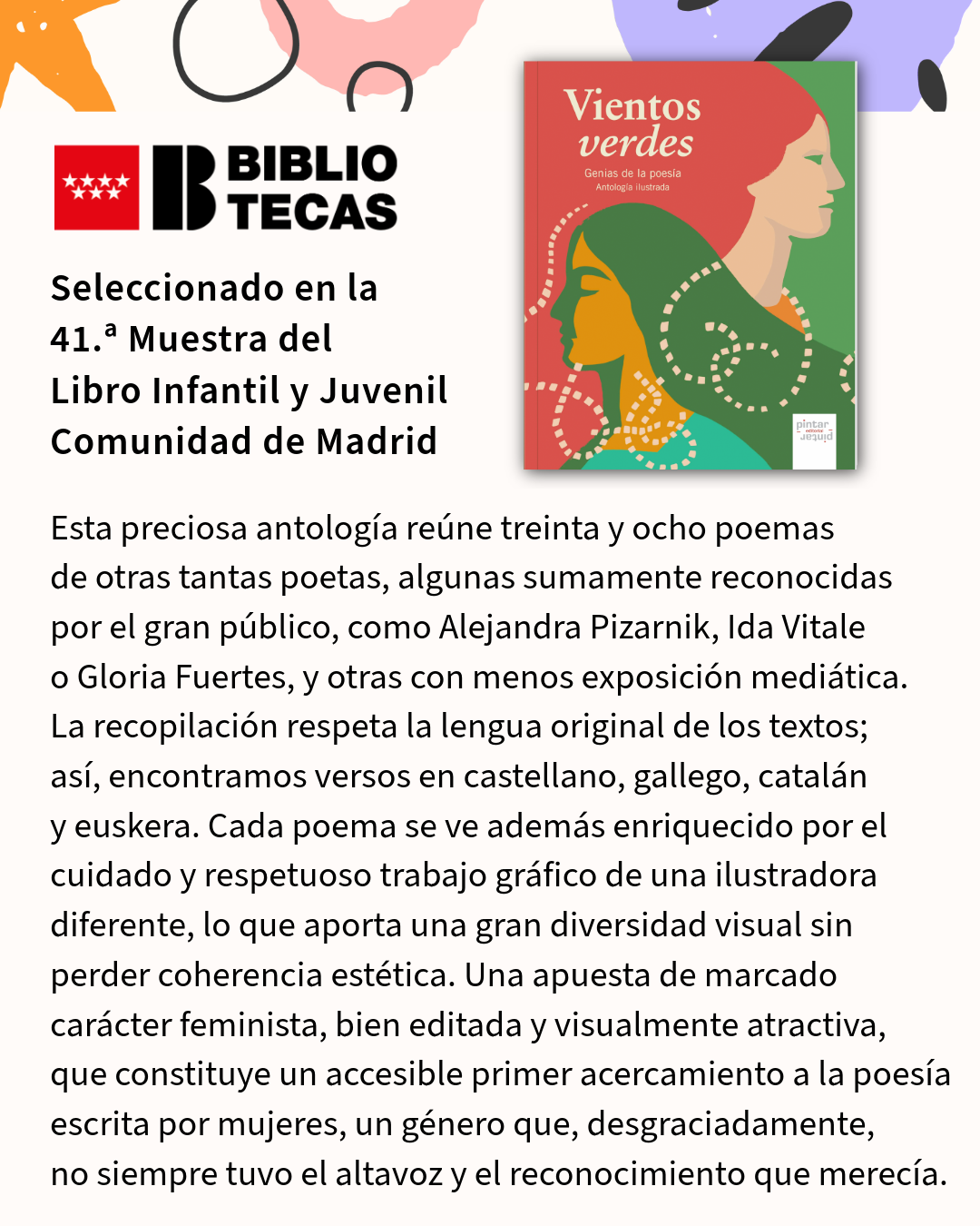 Recibimos una de esas noticias que alegran de verdad el trabajo cotidiano de una editorial independiente: nuestros libros Vientos verdes. Genias de la poesía y Merlot han sido seleccionados por la Red de Bibliotecas de la Comunidad de Madrid para formar parte de la 41.ª edición de la Muestra del Libro Infantil y Juvenil.