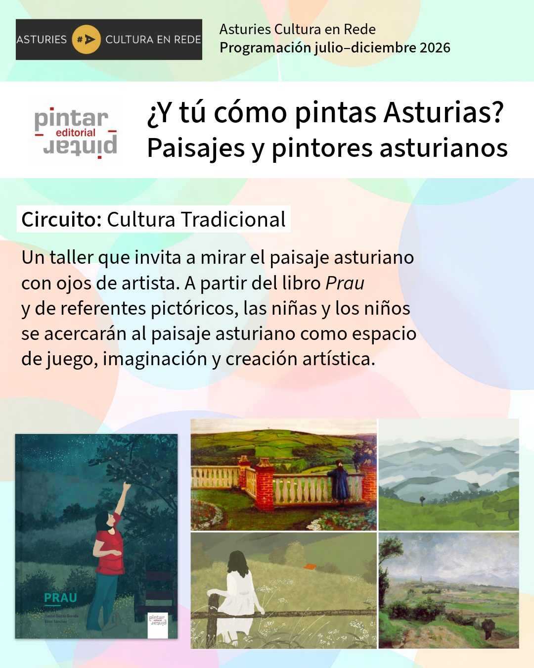 El taller propone observar cómo el paisaje del prau —presente en la literatura y en la experiencia cotidiana— ha inspirado también a pintores vinculados a Asturias como Telesforo Fernández Cuevas, Luis Álvarez Catalá, Nicanor Piñole, Carlos de Haes o Manuel Arboleya.