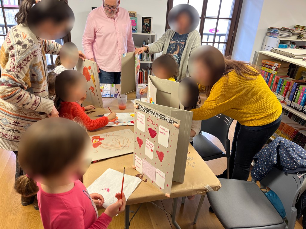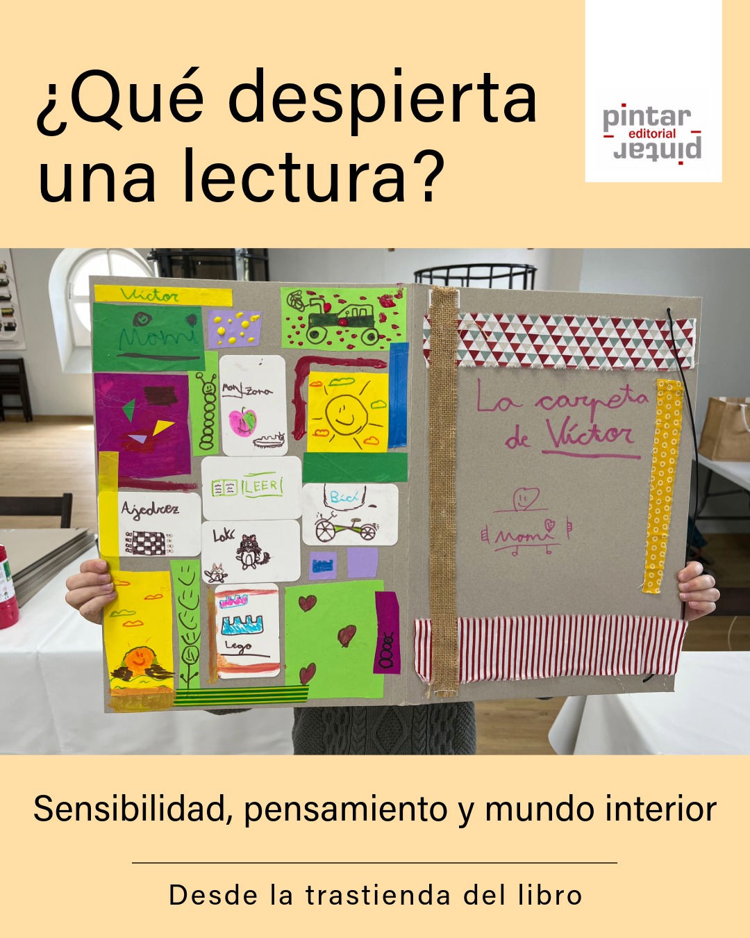 Después proponemos crear una carpeta personal: un lugar donde guardar palabras, recuerdos, cosas que les gustan, fragmentos de su historia. La actividad no busca reproducir el contenido del libro, sino activar en cada niño y niña una respuesta propia a partir de él. Cuando termina el taller, son ellos quienes vuelven corriendo al libro.